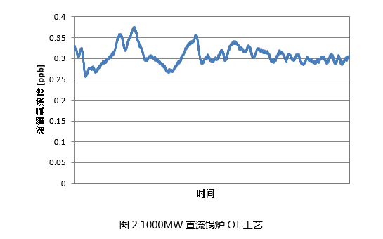 我們分別對600MW AVT和1000MW機組OT工藝過熱蒸汽出口溶解氫測試,得到的溶解氫數(shù)據(jù)圖1、圖2所示。由圖1可知,機組在啟動初期,由于熱力設(shè)備表面沒有形成致密的氧化膜,所以溶解氫的含量非常大,一旦機組運行正常,溶解氧含量逐漸降低,溶解氫也隨之降低并維持在2ppb以內(nèi)。由圖2可知,在1000 MW機組穩(wěn)定期間,由于OT工藝形成了致密的氧化膜,所以溶解氫的含量趨于穩(wěn)定0.3 ppb左右。而Orbisphere 3655以及510系列溶解氫分析儀具有最低檢出限低(0.03 ppb),以及護(hù)圈和底座技術(shù)來保證零點不發(fā)生漂移,能夠很好的滿足客戶對溶解氫的測量需求。